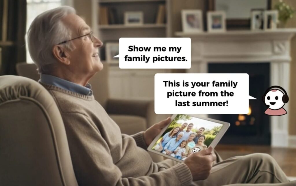 Users can say “Call my daughter” or “Call my caregiver” and instantly connect, without needing to remember numbers or navigate menus.