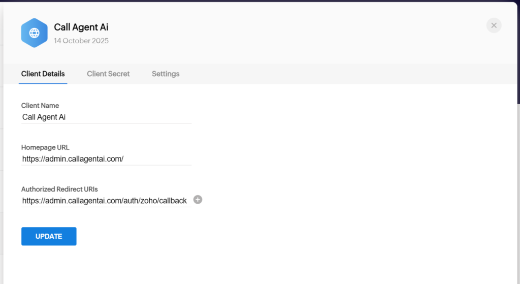 • Set the Authorized Redirect URIs to: https://admin.callagentai.com/auth/zoho/callback